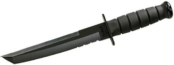 Ka-Bar tanto black (4-1245cp-5). the tanto blade shape, of Asian influence, has a thick pointed blade that's good for penetration. Coupled with a glass-filled nylon sheath this knife is designed for the toughest of tasks. Features: - weight: 0.75 lb. - blade type: fixed blade - measurements: - blade length: 8" - overall length: 12-7/8" - edge angles: 20 degrees - shape: tanto - steel: 1095 Cro-Van - grind: hollow - handle material: Kraton G - HRc: 56-58 - blade thickness: 0.165