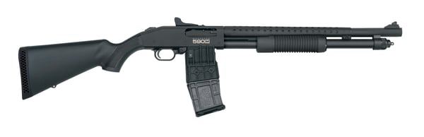 When it comes to detachable magazine pump-action shotguns, the Mossberg 590M has the balance, construction, and a mag durability you need. Along with mag-fed convenience, the 590M features positive steel-to-steel lockup, twin action bars, drilled and tapped receivers, and an ambidextrous safety.