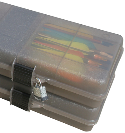 Designed to fit into a soft bow case pockets of the 1990’s, which were longer back then. The Compact Arrow Case holds 18 arrows with broadheads or 24 full length target arrows. The case is held shut with MTM's snap-lock latch system. Movable notched foam padding keeps your arrow fletching protected and separated. Hinges use stainless steel pins. Two padlock tabs are provided for security. Made with luggage grade, polypropylene for longevity. 5 Year Guarantee. Made in USA.