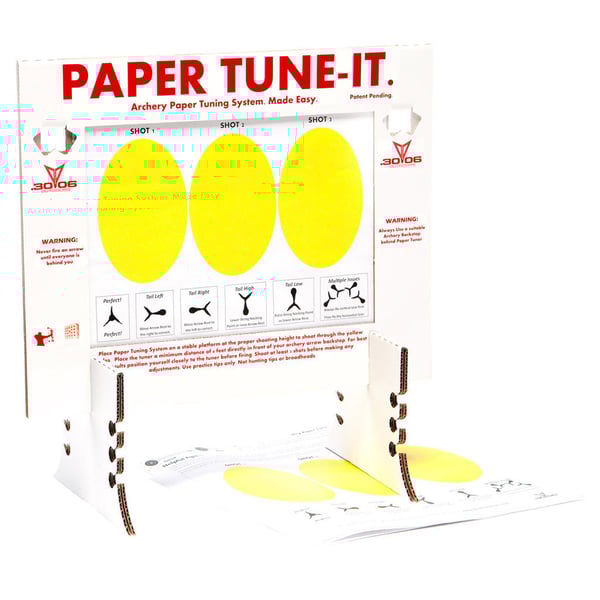 Archery paper tuning system that assures proper arrow flight. Gives easy step-by-step archery tuning tips. Lightweight and portable for use anywhere. Includes tuning station and 10 sheets of ?how to? tuning paper.