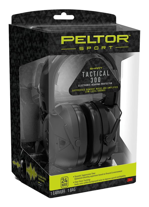 Peltor Sport Tactical Electronic Hearing Protector earmuffs have low-profile cups for rifle/shotgun use to suppress gunshot noise and amplify low sounds using proprietary 3M SMART technologies, and have an auto shut-off feature. Gunshot Recognition and Suppression Technology optimizes noise protection based on the firearm being used and the environment in which it's being used. Clear Voice Tracking Technology seeks voice amongst the noise to improve speech intelligibility and situational awareness. Engineered for optimal fit and comfort, the vented, adjustable headband improves comfort when worn with hats, low-profile cups have cut-outs for use with long guns, intuitive buttons and voice guidance let you operate without removing headset. These earmuffs have durable, recessed microphones designed to reduce wind and fan noise. The Sport Tactical 300 has a targeted NRR of 24 dBA for passive sound protection.