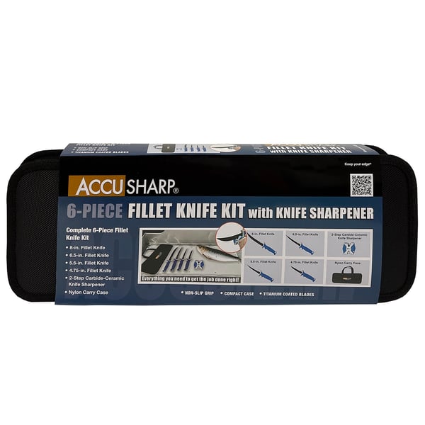 Accusharp 6-piece kit comes with an 4.75/5.50/6.50/8" fillet knives. The blades are made from satin finished stainless steel then coated with titanium to strengthen the cutting edge against premature wear. The fish scale design on the non-slip grip handle features an over molded TPR surface for a secure and comfortable grip while handling the knife. Comes with a nylon carry case and our AccuSharp 2-Step Carbide-Ceramic Knife Sharpener to keep your edge.