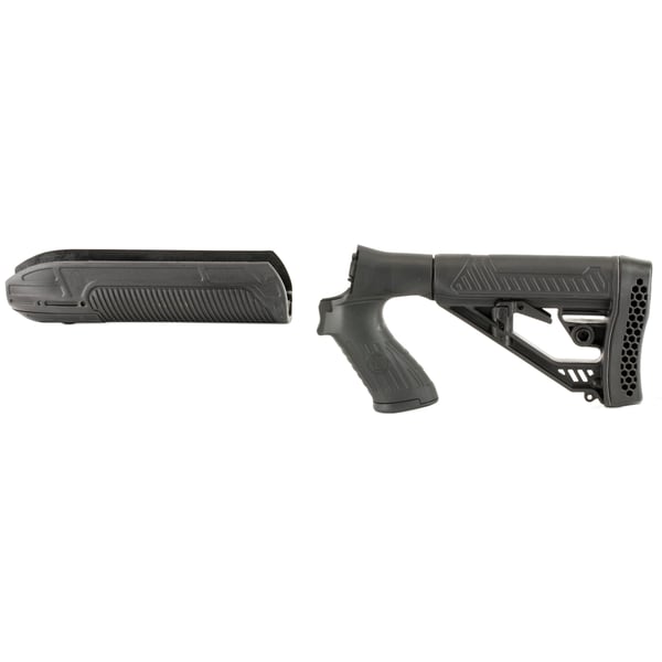 The Adaptive Tactical Forend and M4-Style Stock for Mossberg Shotguns is optimized for pump shotguns. The advanced design features and high-impact polymer construction of the EX Performance Adjustable Stock and Forend make it an ideal choice when upgrading your Mossberg 500 and 590 series 12 gauge pump shotgun.The EX Performance Forend features a 2 inch picatinny rail concealed under the nose cap. Uncovered it's ideal for attaching tactical accessories like lasers or lights. The EX Performance M4-style Stock with pistol grip features an easy-to-reach rapid adjust lever for custom length-of-pull, and includes an integrated QD swivel attachment and molded in non-rust standard sling swivel attachment. Durable polymer construction with non-slip vented rubber recoil pad, oversized extra strength adjustment pin and sleek industrial design.