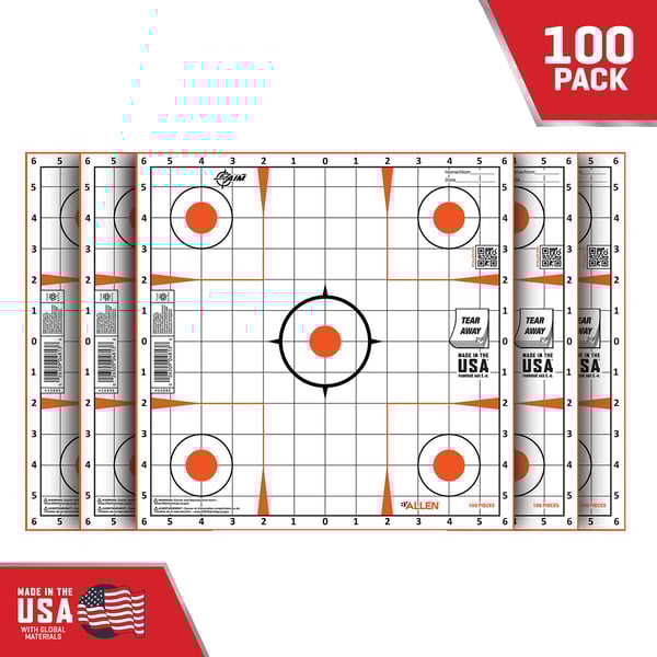 The EZ Aim Sight Grid Target is a great all purpose target. The bound design is easy to handle and keeps targets looking great. It has five aiming points on a one-inch grid background. The grid background makes sight or scope adjusting easier. The target is 12" x 12". Two color print, Aiming points are one inch, bright orange color. Black gridlines and details. 100 targets per pack