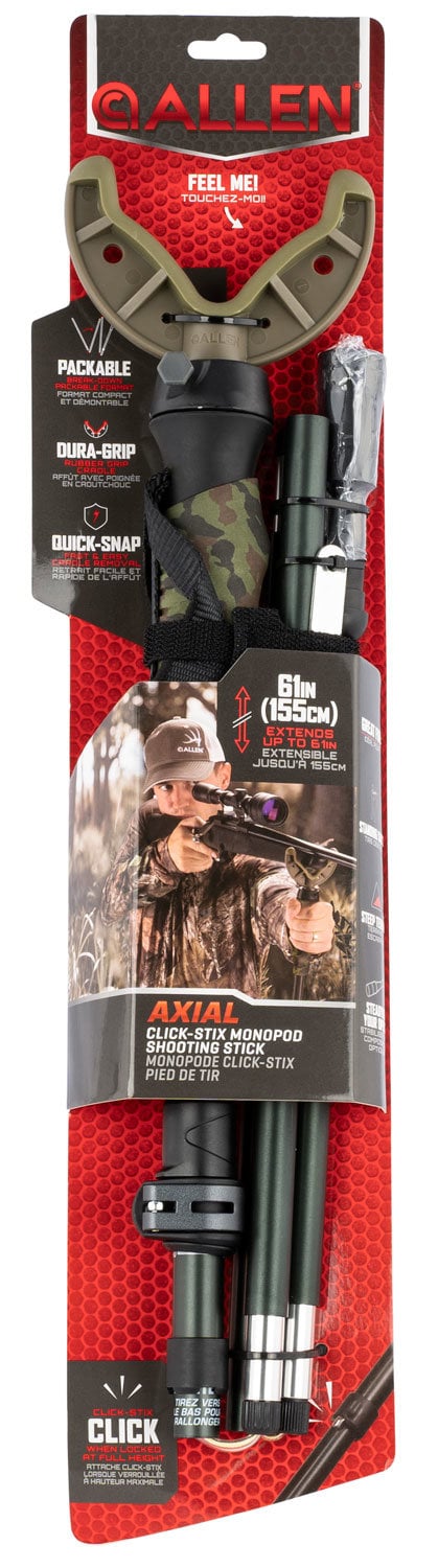 Allen's Axial Click-Stix Monopod is great for use in ground blinds as a shooting rest, camera base or with a spotting scope. Its height adjust to 61" tall, while the removable cradle features a dura-grip rubber grip. The Quick-Snap post allows for fast cradle removal and seamless switching between accessories. The monopod also utilizes aluminum tripod and locking cams, carbide tip and rubber boot and a padded strap.