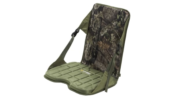 - Feature 1 - Molded EVA seat, Feature 2 - Folds Flat for Easy Storage and Carrying, Feature 3 - Adjustable Side Straps Let you Control Your Recline, Feature 4 - Adjustable webbing strap with buckle to attach to a pack, belt loop or tree stand, Feature 5 - Waterproof Bottom Fabric, Feature 6 - Mossy Oak Break-Up Country Camo, Feature 7 - Seat: 15.75" wide x 12.5" deep x 1" high, Feature 8 - Back: 12.5" wide x 17" high