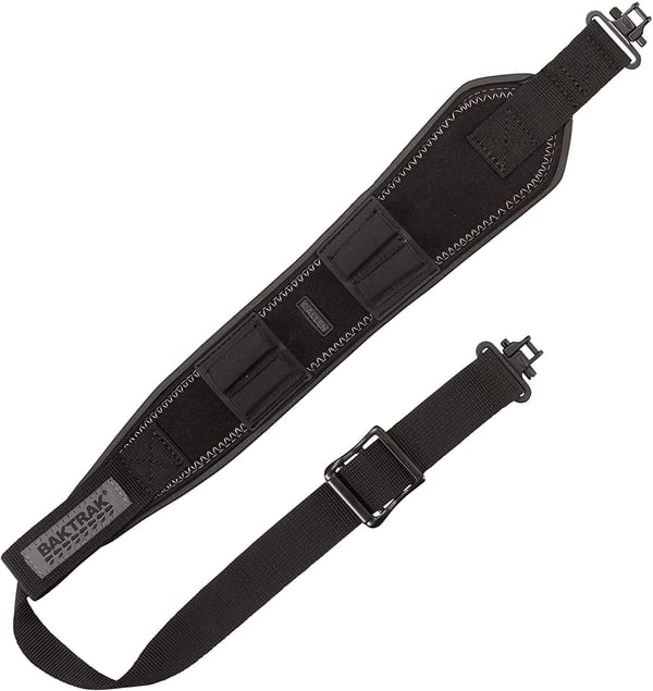 The allen BakTrak bullet sling has a soft molded rubber tread grip back for extreme grip that reduces sling related noise. This one hand, quick adjusting sling has a cushioned fit, Four elastic loops to hold rifle cartridges, and swivels that are tested to 300 pounds.