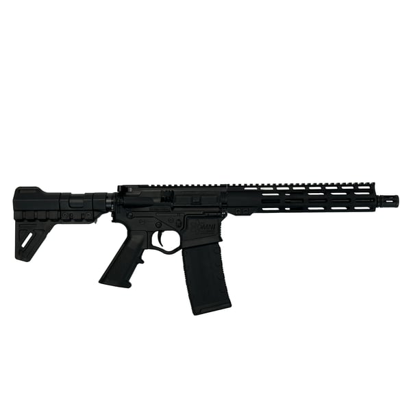 ATI Omni Hybrid Maxx AR-15 pistol in Black, 10.5" barrel, and 10" M-Lok rail. Pistol features a fully-patented metal reinforced polymer upper receiver along with a fully-patented metal reinforced polymer lower receiver. Chambered in .300 AAC Blackout caliber. Comes with a factory installed blade style pistol brace, and 30rd magazine.