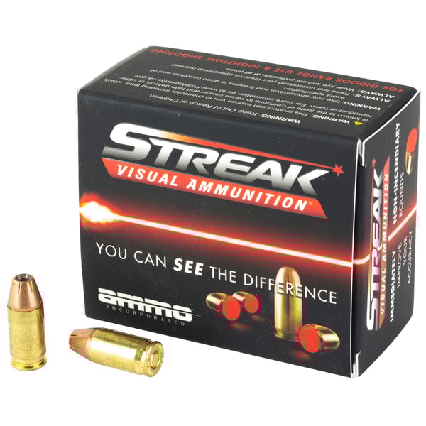 Ammo, Inc. STREAK Visual Ammunition's exclusive and patented technology allows the shooter to visually see the projectile's path towards its target. STREAK rounds are non-incendiary, meaning they don't generate heat and thus are safe to use in environments where traditional tracers are prohibited and can be a serious fire hazard. The results are game-changing in many aspects for the consumer, law enforcement and military. For indoor range use and nighttime shooting.