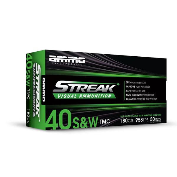 Ammo, Inc. STREAK Visual Ammunition’s exclusive and patented technology allows the shooter to visually see the projectile’s path towards its target. STREAK rounds are non-incendiary, meaning they don’t generate heat and thus are safe to use in environments where traditional tracers are prohibited and can be a serious fire hazard. The results are game-changing in many aspects for the consumer, law enforcement and military. Excellent for indoor range use and nighttime shooting.