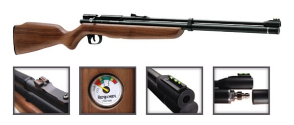 The gun comes with a hardwood stock, Williams fiber optic front and rear sights, and a built-in air pressure gauge.