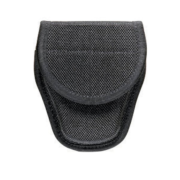 This handcuff case has a Black trilaminate construction with ballistic weave exterior, high-density closed-cell foam center, and soft polyknit lining, Holds one pair of standard handcuffs. Velcro closure, 2 1/4 in. belt loop.