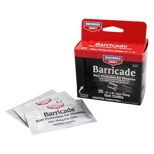 Barricade™ 5" x 8" Rust Take-Alongs Parcket by Birchwood Casey®. Take-Alongs. Barricade™ Rust Protection rapidly drives out moisture from metal pores and deposits a transparent protective coating which seals the surface. It's the best way to protect your firearms from rust. Withstands 500 hours in ASTM humidity test and 96 hours in ASTM salt spray test. Barricade™ Rust Protection is also an excellent penetrant for loosening rusty or frozen parts, as well as a good lubricant and an effective bore cleaner. Take your pick of how you'd like to protect your firearms - with a variety of can options! It's never been easier.