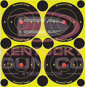 Shoot-N-C high-visibility targets enable you to see bullet holes instantly, without the aid of spotting scopes or binoculars. Shoot-N-C is great for use with all firearms including air guns, pistols, rifles and shotguns. Self-adhesive Shoot-N-C targets feature a fluorescent, chartreuse background color with a flat black coating. When hit, the black coating flakes off approximately two times the size of the bullet hole leaving a bright yellow ring around each shot that is visible from long distances with the naked eye. This high visibility makes Shoot-N-C superior for indoor and outdoor ranges, as well as low light conditions.