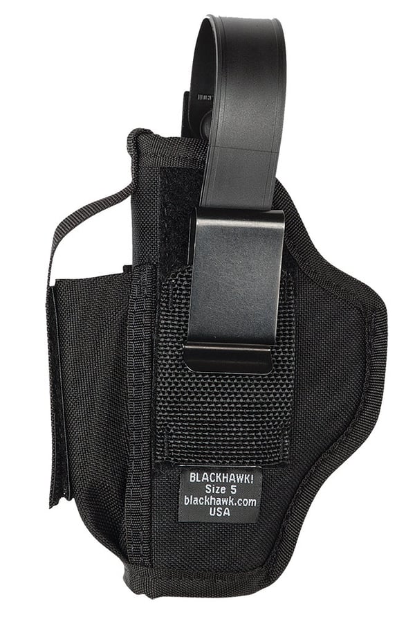Blackhawk ambidextrous holster lets you choose how you want to use it on a daily basis. Wear it as a belt holster on either right or left side, through the unique injection molded belt loops that also act as a cover for the reversible retention strap and thumb break. You can also wear it as an inside-the-pants holster with the spring steel removable clip that secures it to your waistband. Fits belts up to 1.75" in the vertical position and 1.50" in the horizontal position. Adjustable pouch mounted to the front of the holster lets you keep a spare magazine or illumination tool.