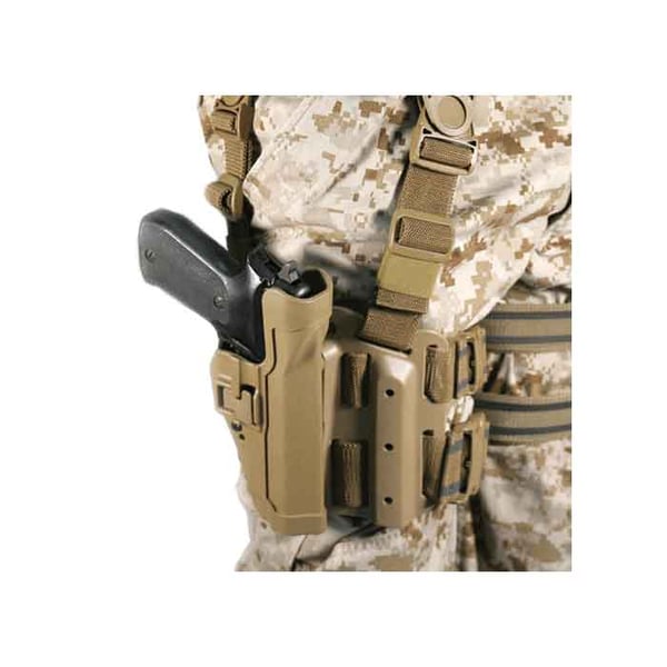 The left-handed Blackhawk 4305 Level 2 Tactical SERPA Holster is a thigh-mounted carry system for your firearm. Its adjustable straps provide a secure fit and the Y-shaped suspension harness distributes load effectively, making it comfortable to carry. The belt loops feature swivel buckles, allowing it to move with you for unobstructed mobility. The holster features the SERPA locking system, which automatically secures your weapon to prevent takeaways, as well as an adjustable tension screw that allows you to dial in your ideal balance of security and access. Despite its high retention level, the simple release mechanism allows a fast and natural draw simply by indexing the finger.