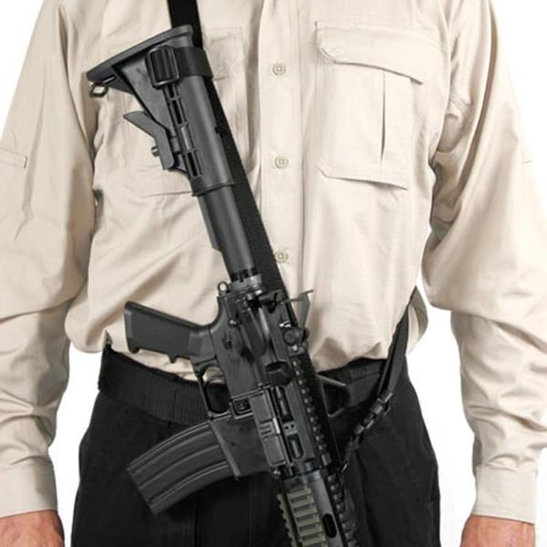 Universal design for easy compatibility with a wide variety of front sling mounts and fixed or collapsible stocks. Fully adjustable ambidextrous design. Constructed of heavy duty 1.25" nylon webbing. Integrated Quick cam buckle provides for rapid one hand sling adjustment and easy shoulder to shoulder transition.