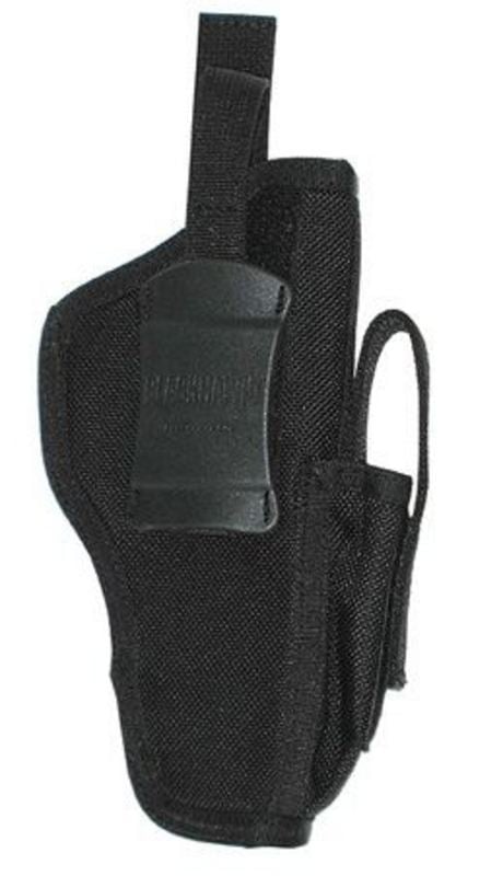 This classic, medium high ride design allows you to carry your favorite revolver or auto on any belt up to 2" wide. Made of 1000 denier nylon, closed cell foam padding and smooth nylon lining. Tough nylon web retention strap has combination adjustment buckle and sturdy snap for easy draw. Nylon web sight channel. Sizes accommodate small, medium and large frame revolvers and autos. Extra-Strength injection molded belt loop accepts belts up to 2".