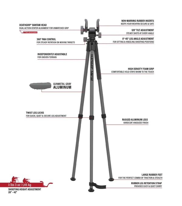 - DeathGrip Clamp: Dual-action head secures rifles up to 40 lbs