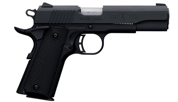The Browning® Black Label® 1911-380 Semi-Auto Pistol is a scaled down version of the John M. Browning designed M1911. The Black Label 1911-380 is 85 percent the size of a Model 1911 in .45 ACP, making it a more compact pistol for concealed carry, yet the grip is long and wide enough to allow much greater shooting control than is offered by smaller .380 ACP pistols. Similar to a full-size 1911, the Browning 1911-380 operates with a locked-breech recoil-operated system, which uses a much-lighter recoil spring than blowback-operated 380 pistols, making manual operation of the slide easy. Disassembly of the 1911-380 is also similar to a full-size 1911. The Black Label 1911-380 is constructed with a composite mainframe, with separate grip panels, and a matte black finished steel slide. The grip features a flared beavertail grip safety with a checkered and raised memory bump. The flat mainspring housing has a non-aggressive textured pattern to aid in providing a sure grip. The extended ambidextrous thumb safety is easy to reach and intuitive to operate with either hand. Low-profile combat sights minimize the risk of snagging when drawing the pistol and provide rapid sight acquisition. The Browning Black Label 1911-380 Semi-Auto Pistol is a thin, compact concealed carry pistol, just large enough to be user friendly and easy to hit targets with. Comes with 1 8-round, heat-treated steel magazine and a black ABS gun case.