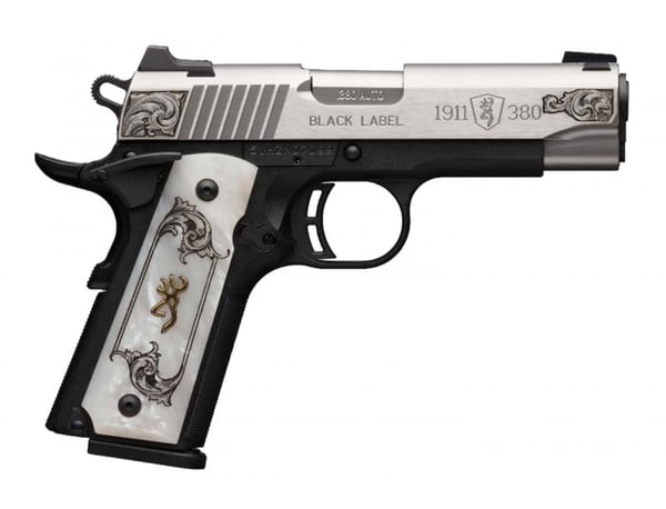 The Browning 1911-380 is ideally suited for concealed carry duty, and for a wider variety of shooters. It features a single-action trigger, both an ambidextrous manual thumb safety and grip safety, and a natural grip angle which offers instinctual pointing and a feel that 1911 shooters are already familiar with. The 1911-380 also has a low bore axis, combat style sights, and steel body magazine. This Medallion Compact model features a stainless steel slide w/Neo-Classical American engraving, white pearl engraved grip, 3-dot sights, and comes with 2-magazines.
