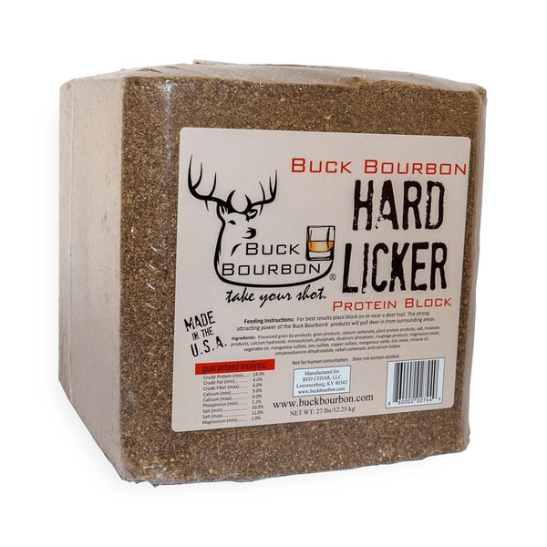 Buck Bourbon Hard Licker is our special protein block that deer canâ?t resist. It features our same proprietary blend of Bourbon by products to give it an irresistible attraction and sweet aroma. Hard Licker is a 25 pound block that will pull deer in from long distances. Tested and proven at Salt River Outfitters. Feed Buck Bourbon responsibly.