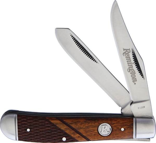 The Remington Cutlery R40016BR Heritage Series Trapper features 420J2 steel, clip and spey blades with a blade length of 2.75 in. The classic wooden handle measures 3.38 in. and overall length of approximately 6.0 in. The 2.6 oz lightweight knife is stylish and functional. Made in China.