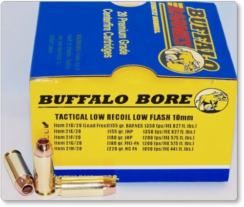 Buffalo Bore Ammunition 21D/20 Heavy 10mm TACXP 155 GR 20Box/12Case For those wanting a load utilizing an expanding bullet that penetrates very deep, this is it. These lead free, all copper Barnes TAC-XP bullets have great penetration in flesh and bone. Buffalo Bore Bullets are utilizing a flash retarded powder in this load, so that the vision of the shooter will not be significantly impaired should he be required to drop the hammer in low light. Roughly 95% of all civilian shootings in the US happen in low light when the criminal element is most active. Not being blinded by your own gun fire can be a significant advantage.