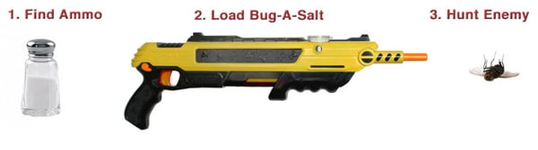 The Bug-a-salt shoots a shotgun spray of regular table salt and decimates flies on contact.  A surefire fun way to enjoy a disgusting task.  Rid your house of all those pesky pests and have a blast while doing it.