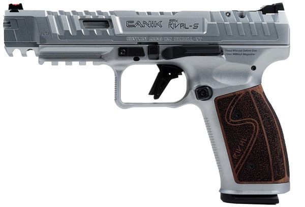 The Canik SFx Rival-S is taking steel framed pistols with the weight needed to manage even more recoil. The Rival-S features 90 degree aluminum flat trigger; competition magwell; Picatinny rail on frame; optic ready w/Co-witness; ambidextrous controls and forward indexing points. Includes two magazines, two aluminum mag base plates, mag loader, external mag-well, custom holster, 5 optic plates, Canik Punch & Tool kit, three backstraps, three mag release extensions, gun lock and manual.