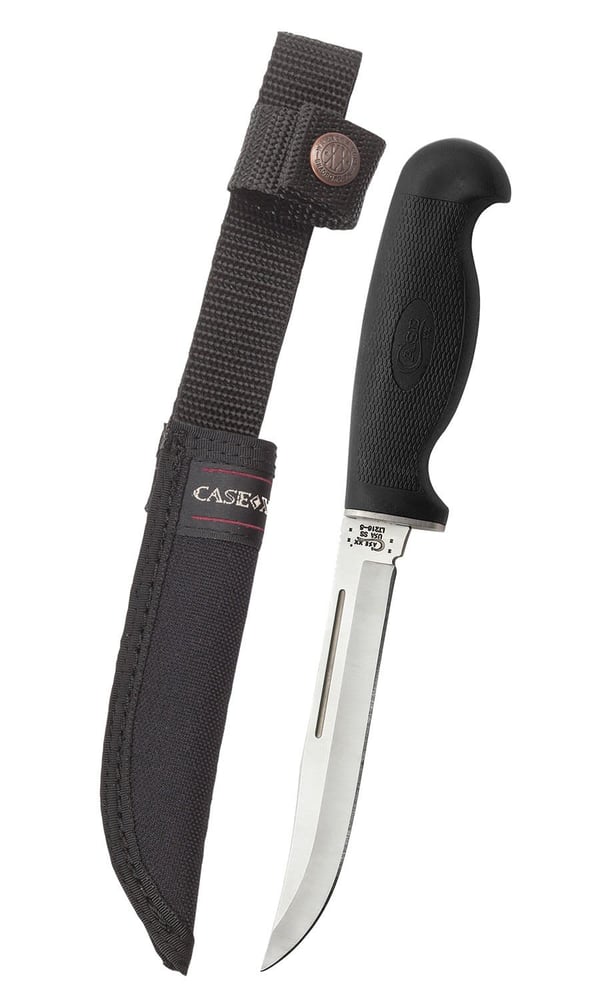 The Black Lightweight 5-inch Utility Hunter is a part of Case's Lightweight Hunters family. This collection features easy-gripping waterproof handles and specialized stainless steel blades for optimal performance in any condition. This fixed-blade knife features a sabre-concave ground Clip blade and a black synthetic handle with the Case Logo. The Lightweight Utility Hunter is a versatile field knife, ideal for deer, trout, rabbit and other game. The thin profile of the Clip blade is perfect for detailed work when control is important. This durable fixed knife is constructed with Case Tru-Sharp™ stainless steel which is a special high-carbon steel that helps the blades hold an edge longer than conventional steel. It also offers extraordinary blade strength and corrosion resistance. Comes with a ballistic nylon sheath. This fixed blade knife is perfect for the outdoors, hunting, or hiking. Comes conveniently packaged in a box. Made in Bradford, PA, USA from domestic and imported materials.