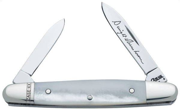 Then there are the twin blades. A Clip blade and a Pen blade. The Clip blade features a fingernail groove cut into it which makes it easier to open from it's closed position. It also features the signature of the 34th president Dwight Eisenhower.