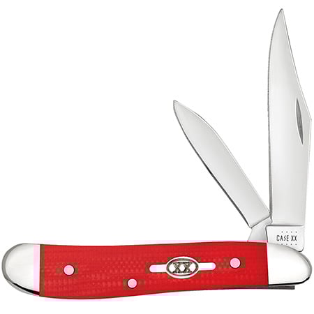 The Case Peanut Knife has polish finished, Tru-Sharp stainless steel clip point and pen blades along with a smooth red G-10 handle. Includes nickel silver bolsters, steel liners, and the Case oval shield.