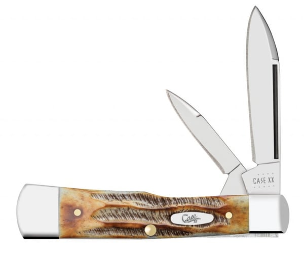 The 65322 Case 6.5 BoneStag (6.52130SS) Gunstock Knife features spear and pen blades made of mirror polished Tru-Sharp Surgical Steel with nail nicks for opening. The jigged, hand flamed BoneStag handle, 3 3/4 inches closed, has the Case Oval Script shield and nickel silver bolsters. The Case Gunstock Knife weighs 3.3 ounces. Made in the USA.