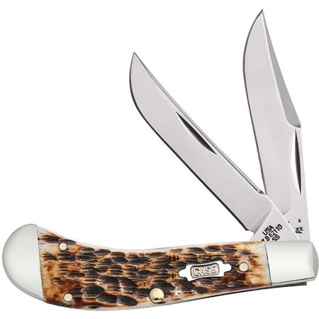 Case XX Knives - Saddlehorn Burnt Amber Bone Model: CA27644. Closed: 3 1/2"; Blade: Stainless | Standard Edge | Mirror Polish Finish; Other Info: Inlay Shield | Nickel Silver Bolsters. TB62110SS pattern. Clip and skinner blades. Burnt amber peachseed jigged bone handles. Boxed.