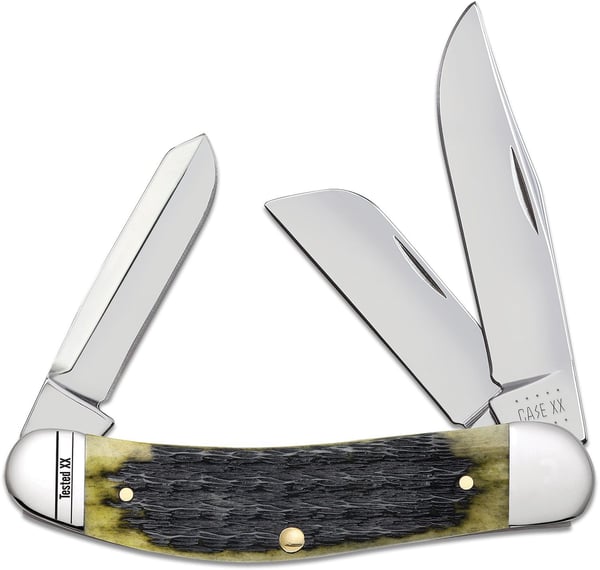 e natural bone handle of this knife features a scale-like pattern of jigging and a deep olive color. The Sowbelly knife was named for its resemblance to the shape of a pig's belly. This knife is a heavy-duty version of the Stockman knife that has Clip, Spey, and Sheepsfoot blades. The Clip and Sheepsfoot blade sit on the pocket end while the Spey blade sits on the cap end. The Clip blade is commonly used as a multi-purpose blade and preferred for detail work. The Sheepsfoot blade allows for added strength at the point making it great for carving and achieving a clean cut. The Spey blade is commonly used as an all-purpose utility blade. This knife is constructed with Case Tru-Sharp stainless steel which is a special high-carbon steel that helps the blades hold an edge longer than conventional steel. It also offers extraordinary blade strength and corrosion resistance.