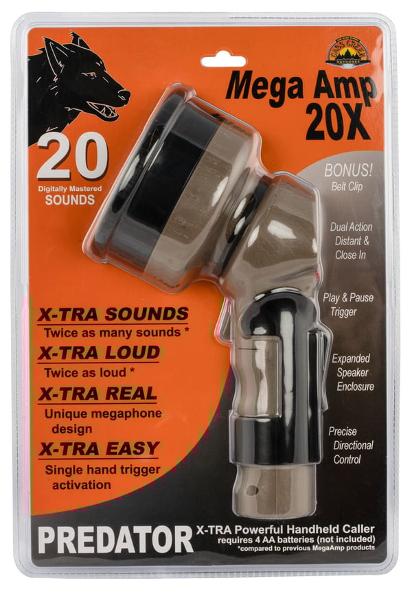 The Mega Amp will give you the hunting edge without breaking the bank. Each of the 20 calls are the essential calls every hunter needs to bring the game in closer Locator: 1 Adult coyote locator howl; 2 Female Howl; 3. Mouse Squeaks; 4. Baby Pig Distress; 5. General Howls; 6. Coyote Pups yipping; 7. Alpha Challenge; 8. Rat Squeal; 9. Small rodent distress; 10. Wounded Coyote; 11. Hog Distress; 12. Territorial Beta Male; 13. Crow Baby Distress; 14. Adult Cat Distress; 15. Cottontail Distress; 16. Fawn Distress; 17. Coyote Food Fight; 18. Fleming Hare Distress; 19. Grey Fox Pups whining and yipping; 20. Jackrabbit Young Distress. Operates on four AA batteries. Includes belt clip.