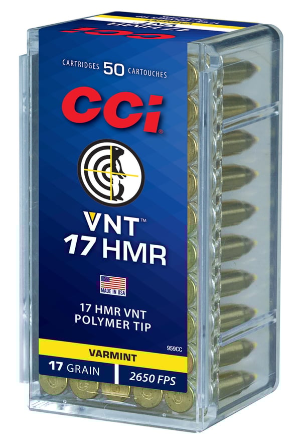 One look is all it takes to know that CCI understands what varmint hunters desire. The Varmint Ammunition line features a variety of bullet technologies that are designed for the same goal: total devastation on impact.The VNT load allows you to devastate varmints or drill targets at long range. The loads feature a Speer bullet with an extremely thin jacket and polymer tip that team up to offer flat trajectories, superb long-range accuracy and explosive terminal performance on impact. Specifications:17 HMR/17 gr/ Varmint Tipped/50 Per Box/40 Cs