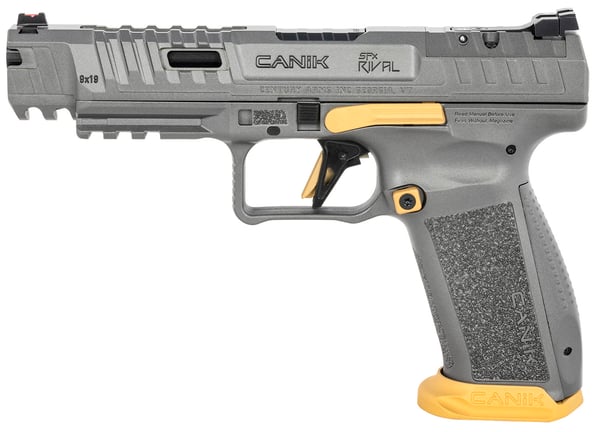 The Canik SFx Rival has a total length of 8.1", a height of 5.7", a 1.41" width, a 5" barrel, and an overall weight of 29.5 oz. With these specifications the Canik SFx Rival can compete in IDPA, IPSC, and USPSA without restrictions. The Canik Rival is available in Canik Rival Grey with Cerakoted gold accents and in an all-black configuration called the Canik SFx Rival Dark Side. With adjustable fiber optic sights, a lightened 90 degree diamond cut aluminum flat trigger, reversible magazine releases and sizes, ambidextrous slide release, aggressively serrated and ported slide, 1913 Picatinny rail, external mag-well, 3 grip back strap sizes, double undercut trigger guard, ergonomically redesigned beavertail, aggressive grip texturing, and a completely modular setup, the SFx Rival is ready to win right out of the box!