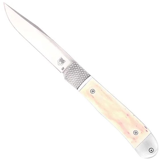 Classic trapper knife upgraded with an automatic hidden release. The textured bone handle with steel bolsters conceals a D2 drop-point blade that deploys when the bolster is pushed. This modern twist on a traditional pattern brings convenience to everyday carry.