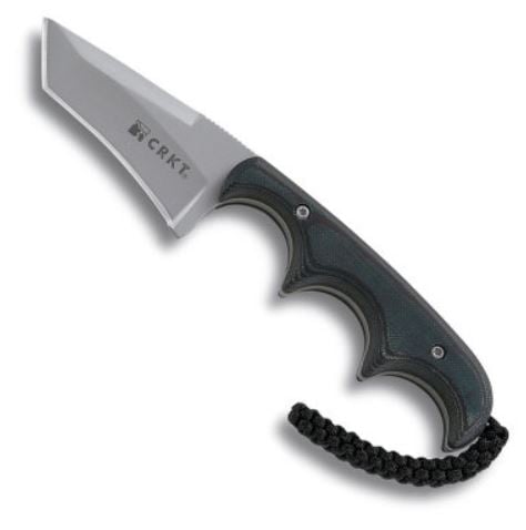 They are very small and lightweight knives which give surprising comfort and control, thanks to the unusual geometry of the full-tang blades, aided by three finger choils, friction grooves for the thumb, hand-contoured green-black resin impregnated fiber scales, and a braided fob. Unlike many small neck knives, this handle is really functional for a wide variety of daily cutting tasks.