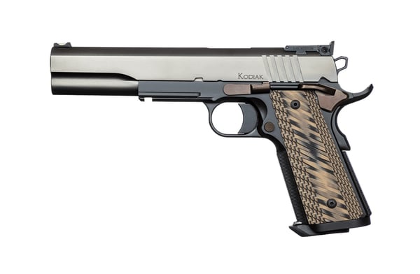 One of our most popular 1911 models, the Kodiak packs a punch with a 6-inch bushing-less barrel chambered in 10mm. These features give the Kodiak a longer sight radius, less felt recoil, less muzzle flip, and increased accuracy while letting full-power 10mm loads achieve their potential.