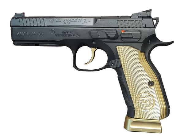 Introducing the CZ Shadow 2 Gold Digger pistol! This exceptional firearm features a double action/single action mechanism, a semi-automatic design, and a sturdy metal frame in 9MM caliber. With its sleek matte black finish and aluminum grips, this pistol not only looks great but delivers top-notch performance. It comes with a manual safety, optics cut slide, fiber optic front sight, adjustable rear sight, and a capacity of 19 rounds. The package includes two magazines, brass grips, trigger, and mag bases for added convenience and customization. To top it off, the "Special Edition" engraving on the frame adds a unique touch to this high-quality pistol. Elevate your shooting experience with the CZ Shadow 2 Gold Digger - a standout choice for discerning customers seeking both style and functionality in their firearms.