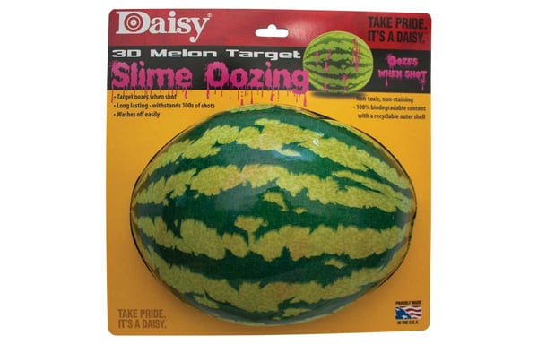 Ever used a watermelon as a target? Now Daisy takes a fun backyard activity to the next level with our new Oozing 3-D Watermelon Target. The three-dimensional watermelon target is fixed to a card which, when used with a safe backstop, provides hours of shooting fun. Save the watermelon for the picnic! These targets are reusable, long-lasting and can withstand a surprising number of BB shots. Every shot produces a flow of pink soy-based oozing slime which is non-toxic. Made in USA with 100% biodegradable content and recyclable outer shell.