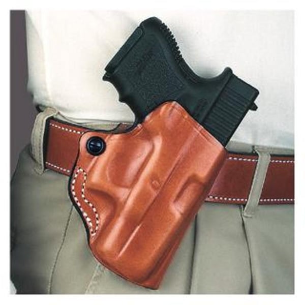 This unique holster has been reduced to the barest of essentials, yet offers a secure grip on the handgun thanks to exact molding and adjustable tension device. The Mini Scabbard(R) will accommodate belts up to 1 1/2" wide. Available in tan unlined leather. Note: Some models without adjustable tension device.