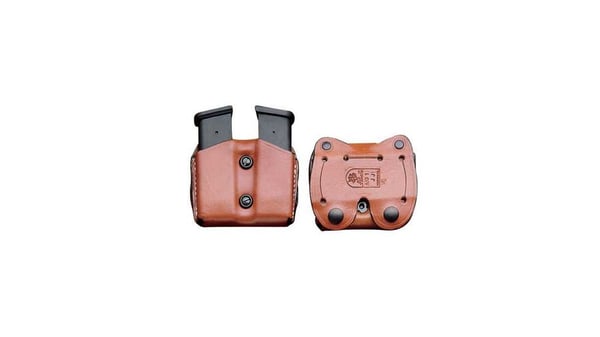 This double magazine pouch features a snap-to-the-belt design. May be carried horizontal or vertical. Available in black or tan unlined leather. Accommodates belts up to 1 3/4" wide. Fully adjustable dual tension device. **PLEASE NOTE: POUCH FOR SMALL CALIBER GUNS MAY NOT ONLY FIT BELTS UP TO 1 1/2" AND MAY ONLY HAVE THE VERTICAL BELT SLOTS.