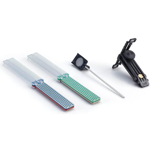 The MAGKIT-4 Magna-Guide kit offers portable sharpening using 2 Double Sided Diafold sharpeners that provide 4 diamond grits. The Aligner Blade Guide (ABG) provides 7-Angle adjustability for the right edge every time and the MAG - Magnetic Angle Guide - joins the two! The Double Sided Diafold Sharpener offers two 4-Inch by 1 inch diamond whetstone surfaces in one lightweight, portable sharpener. Multi-use on blades, kitchen knives, specialty and garden tools, etc. Extra-Extra Fine (3 micron / 8000 mesh) provides the finest polished edge of all bonded diamond abrasives. Extra-Fine diamond (9 micron / 1200 mesh) to polish and refine a razor edge after sharpening with a coarser diamond. Fine diamond (25 micron / 600 mesh) for a razor sharp edge. Coarse diamond (45 micron / 325 mesh) to quickly restore a neglected edge. Convenient size: 9 1/2 inch open - 5 inch closed. Folding plastic handles protect sharpener when not in use. All are stored in a compact, durable plastic kit box
