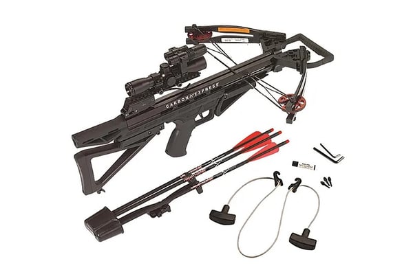 As a lightweight version of the Intercept Axon LT the Intercept Supercoil LT is also a top of the line crossbow that features a unique military AR-style design. Built on the Intercept Chassis the Intercept platform uses the same reliable modular component system as AR black guns. This gives the Supercoil unlimited potential for customization because it can accommodate almost all military and commercial AR parts. Combined with precision engineering and devastating speeds of 360 plus fps the Intercept Supercoil LT gives you absolute confidence to make your best shot. Includes 3 Maxima Hunter Premium Carbon Bolts 4x32 deluxe lighted scope quick-detach 3-arrow quiver with side bracket cocking rope 3 practice points and rail lubricant. Military AR-Style Design The Intercept Chassis crossbow platform uses the same reliable modular component system as AR black guns.Unlimited Customization Picatinny design platform accommodates the most common length of pull positions at 13 14 and 15 inches. It can also mount most military and commercial AR parts including stock grip foregrip optics sling mounts lights lasers and an unlimited number of other tactical shooting accessories to fit your hunting setup.Adjustable Stock & Foregrip Three-position AR style fixed butt stock with comfortable butt plate. 9 inch folding ergonomic foregrip/forearm rail accommodates any shooting style for enhanced repeat performance.Compact Profile Slim Line 13.5 inch limb design with new thinner extruded barrel and lighter machined riser makes for a more responsive front end improved balance and better shooting performance.Easy & Safe Low-profile foot stirrup keeps your foot behind the barrel while downward cocking. The anti-dry-fire mechanism will enhance safety in the field for both left and right-handed shooters.Smooth Firing Gun-caliber machined no-creep trigger and CNC-machined trigger box housing with precision internal components achieve a clean break at a pull weight of just 3.5 pounds.Optimal Speed Precision-engineered aluminum alloy cam set delivers bolts at 360 plus fps on a flatter bolt trajectory. Tunable synthetic bow strings and power cables deliver smooth accurate shooting and extended performance.Deadly Accurate 4x32 deluxe multi-reticle lighted scope with red/ green dual illumination for varying light conditions.