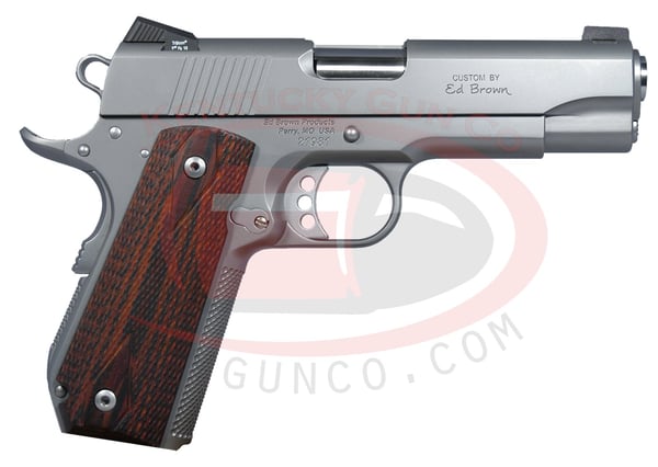 This pistol by Ed Brown is a 9mm 1911 style. It features single action, stainless steel frame and slide with Chainlink III finish, and a 4.25 inch match grade barrel. Weighing in at 35 ounces, you are sure to hit you mark with the white outlined fixed 3-dot dovetail night sights, and be comfortortable while doing it with the laminate wood grips, and the three hole style aluminum trigger.