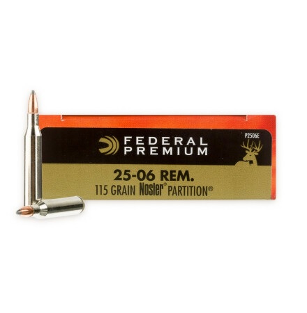 Federal Vital Shok 25-06 Remington115 GR. Nosler Partition Ammunition 20 Round Box. This premium ammunition from Federal is loaded with a Nosler 115 grain Nosler Partition jacketed soft point projectile. This round is designed for maximum effectiveness on light, thin-skinned game such as antelope, mule deer, white-tail deer and black bear. The muzzle velocity of this ammunition is 3030 feet per second, and it produces 2345 foot pounds of energy at the muzzle.